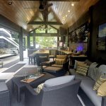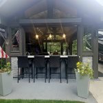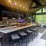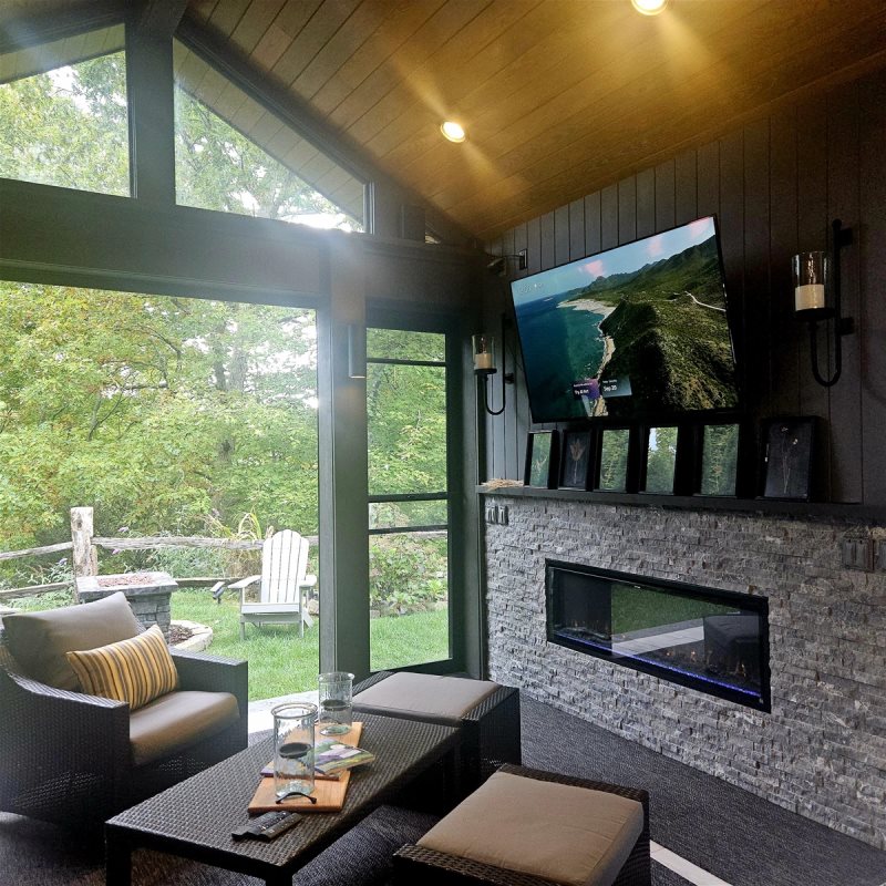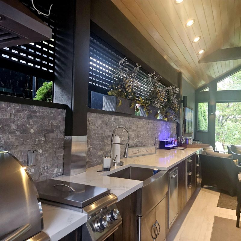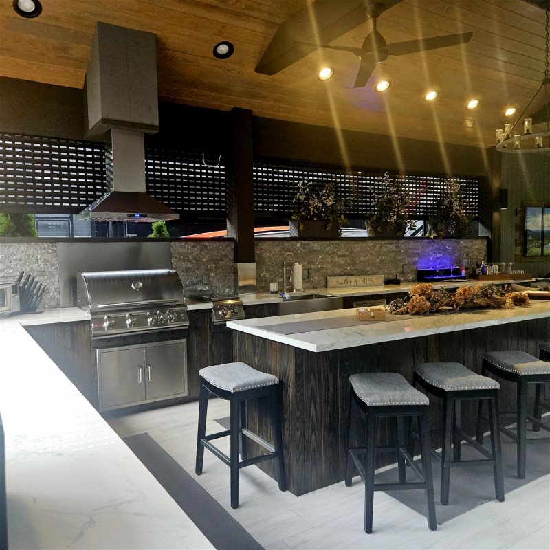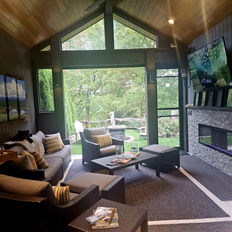 Enjoy this open-air, spacious outdoor pavilion showcasing stylish modern décor. Fully equipped with a gas grill and burner, small refrigerator, microwave, and toaster oven. An impressive 11-foot island seats eight, complemented by an inviting great-room area—perfect for relaxing or entertaining—complete with a large TV and electric colorful fireplace. For added ambiance and privacy, unwind by the cozy outdoor gas fire pit. Let this be your next great outdoor mountain experience!