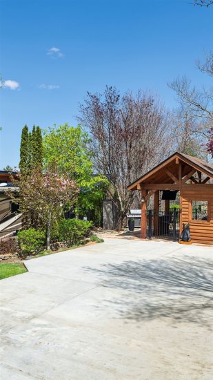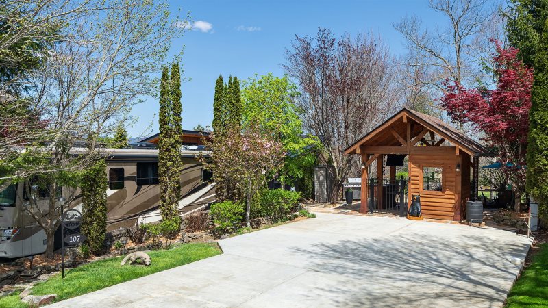 Lot 107 at Mountain Falls Luxury Motor Coach Resort offers a thoughtfully arranged pavilion designed for comfort and versatility. A wood-burning fireplace adds warmth and character, while an outdoor kitchen with a sink and grill supports easy meal preparation. Outdoor furniture and an umbrella provide comfortable seating and shade, and a fenced pet area offers added convenience. The pavilion layout encourages extended outdoor enjoyment in a refined setting.