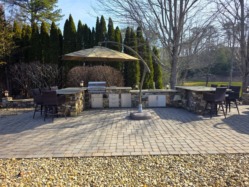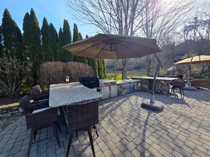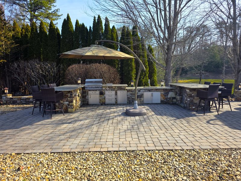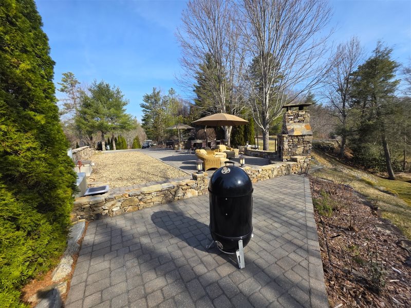 Lot 18 at Mountain Falls Luxury Motor Coach Resort offers a thoughtfully arranged standard site designed for relaxed and comfortable outdoor living. A wood-burning fireplace creates a warm focal point, complemented by kitchen countertops that provide convenient prep space for casual dining. An outdoor sitting area with an umbrella encourages easy relaxation, while a water feature adds a subtle and calming element to the overall setting.