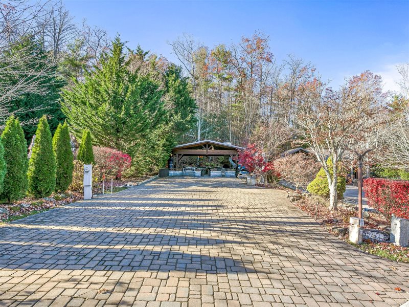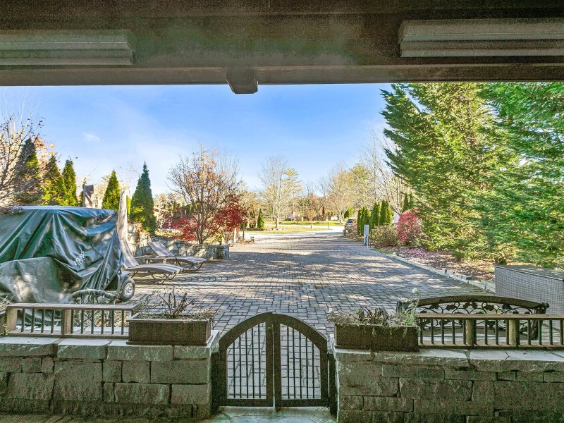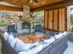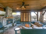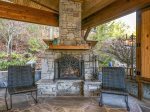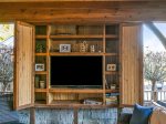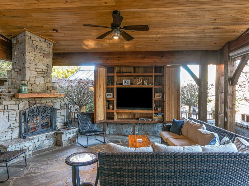 Lot 117 at Mountain Falls Luxury Motor Coach Resort features a pavilion that blends comfort with practical amenities. A wood-burning fireplace anchors the space, creating warmth and ambiance. The pavilion includes an outdoor kitchen with a grill and refrigerator, along with a television for added entertainment. Outdoor furniture and a fenced pet area complete the layout, making this pavilion well suited for relaxed and extended stays.