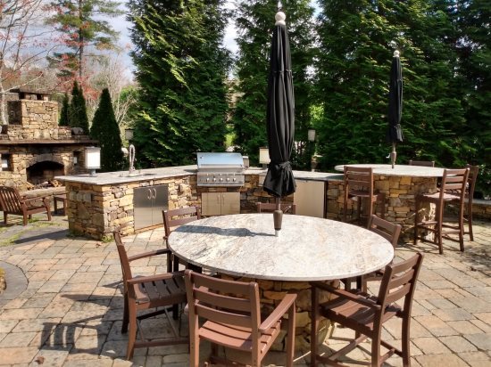 Lot 133 at Mountain Falls Luxury Motor Coach Resort features a well-appointed premium site designed for comfortable outdoor living. A fireplace adds warmth and serves as a central gathering point. The site includes an outdoor kitchen and gas grill, making meal preparation convenient and enjoyable. Outdoor furniture completes the space, creating a relaxed and polished resort environment.